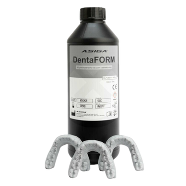 Asiga DentaFORM è un materiale altamente resistente al calore con una chimica di rilascio superficiale unica 'Anti-Stick' che lo rende perfetto per la termoformatura sotto vuoto e a pressione. La formula 'Anti-Stick' di Asiga resiste all'adesione al substrato riscaldato, consentendo di rimuovere l'apparecchio formato senza rotture del modello o dell'apparecchio.