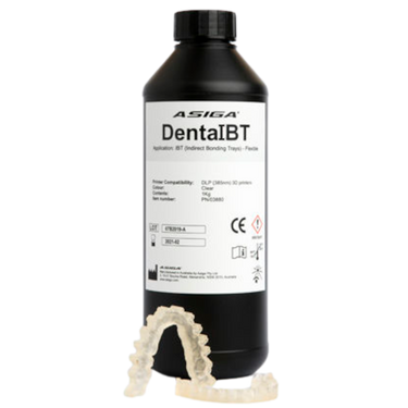 Material biocompatible para la producción de bandejas de encolado indirecto. Asiga DentaIBT es un material biocompatible para la producción de cubetas de cementación indirecta. Las bandejas de unión indirecta se utilizan para colocar con precisión los brackets de ortodoncia en los dientes del paciente. DentaIBT es un material transparente que permite la transmisión de rayos UV para curar los brackets en su lugar. La característica gomosa de Asiga DentaIBT proporciona un agarre firme durante el proceso de unión y por tanto flexibilidad durante el despegado, sin desgarrar ni molestar al paciente. Úselo para bandejas de unión indirecta. Compatibilidad de impresora: impresoras 3D de 385 nm.